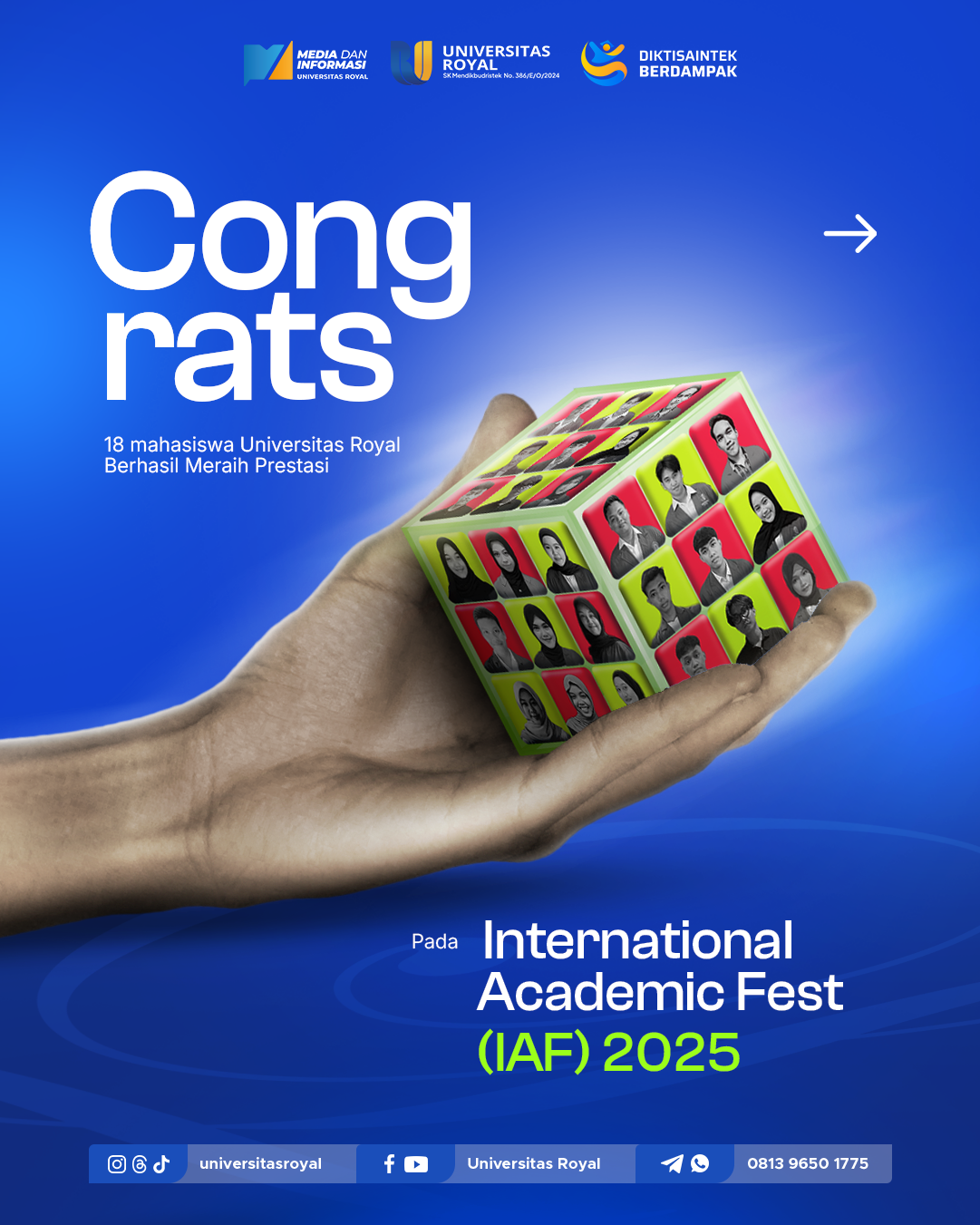 Capaian ini menjadi bukti nyata bahwa mahasiswa Universitas Royal mampu bersaing di tingkat internasional melalui karya ilmiah, inovasi teknologi, proposal bisnis, konten edukatif, hingga desain poster pendidikan.