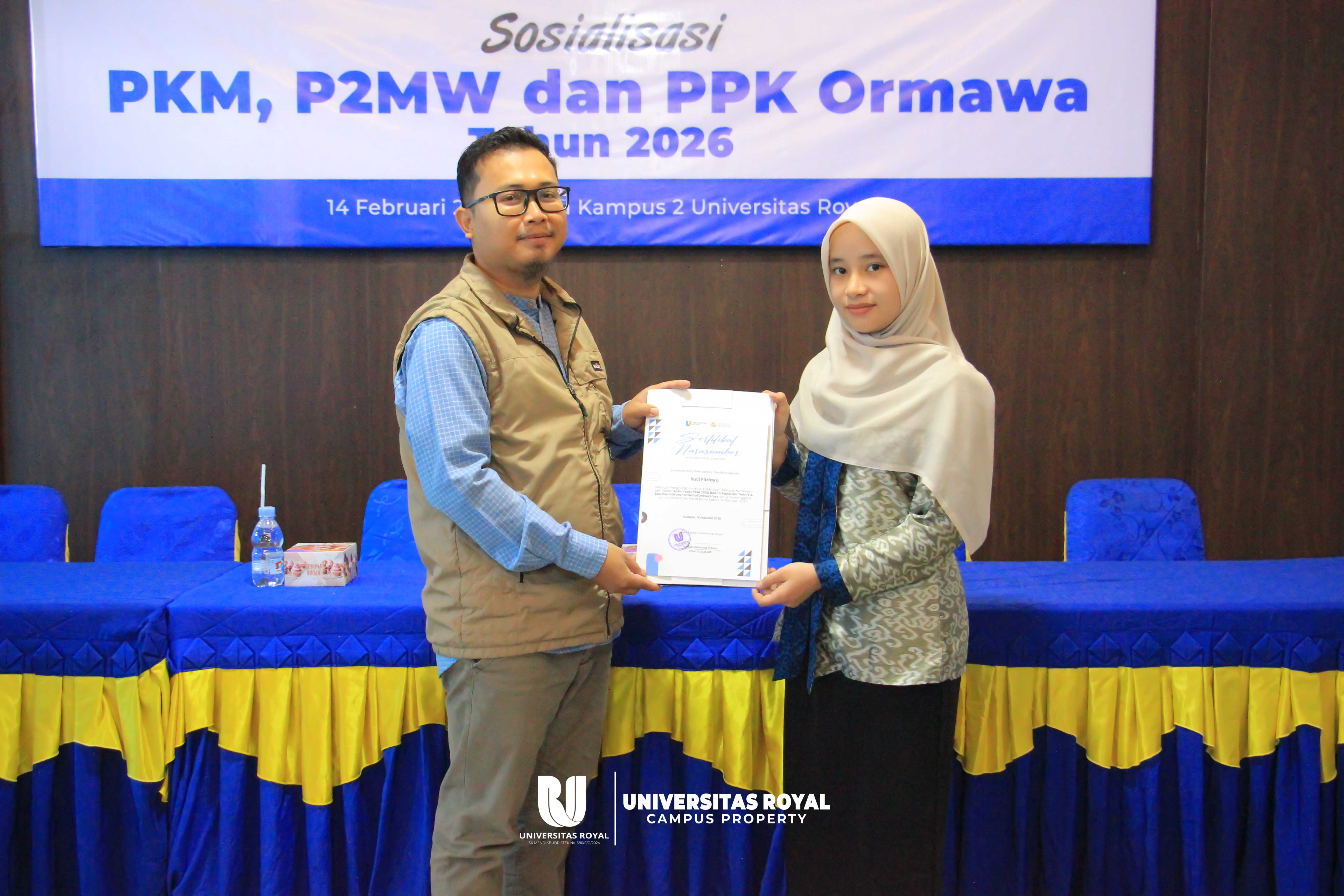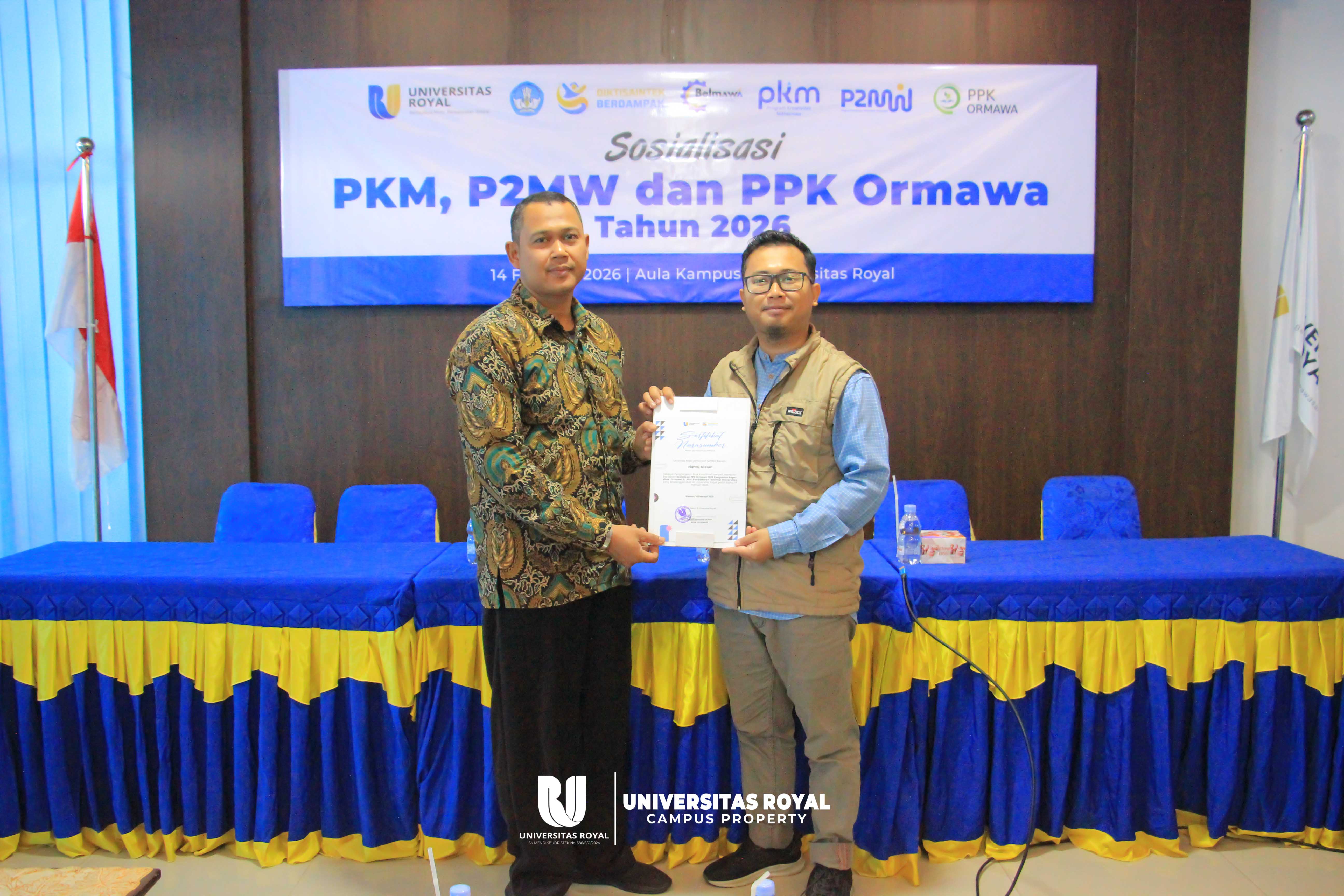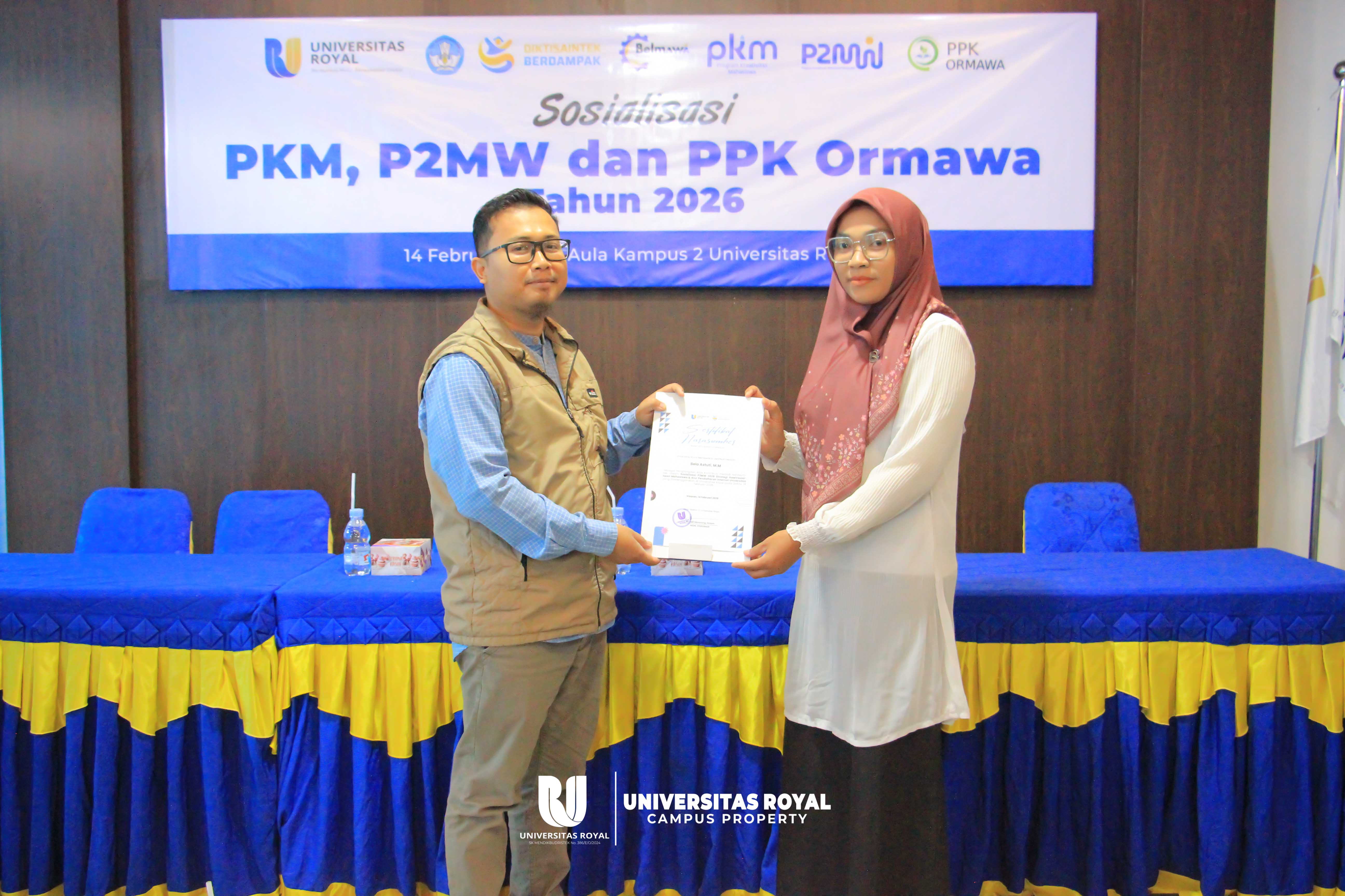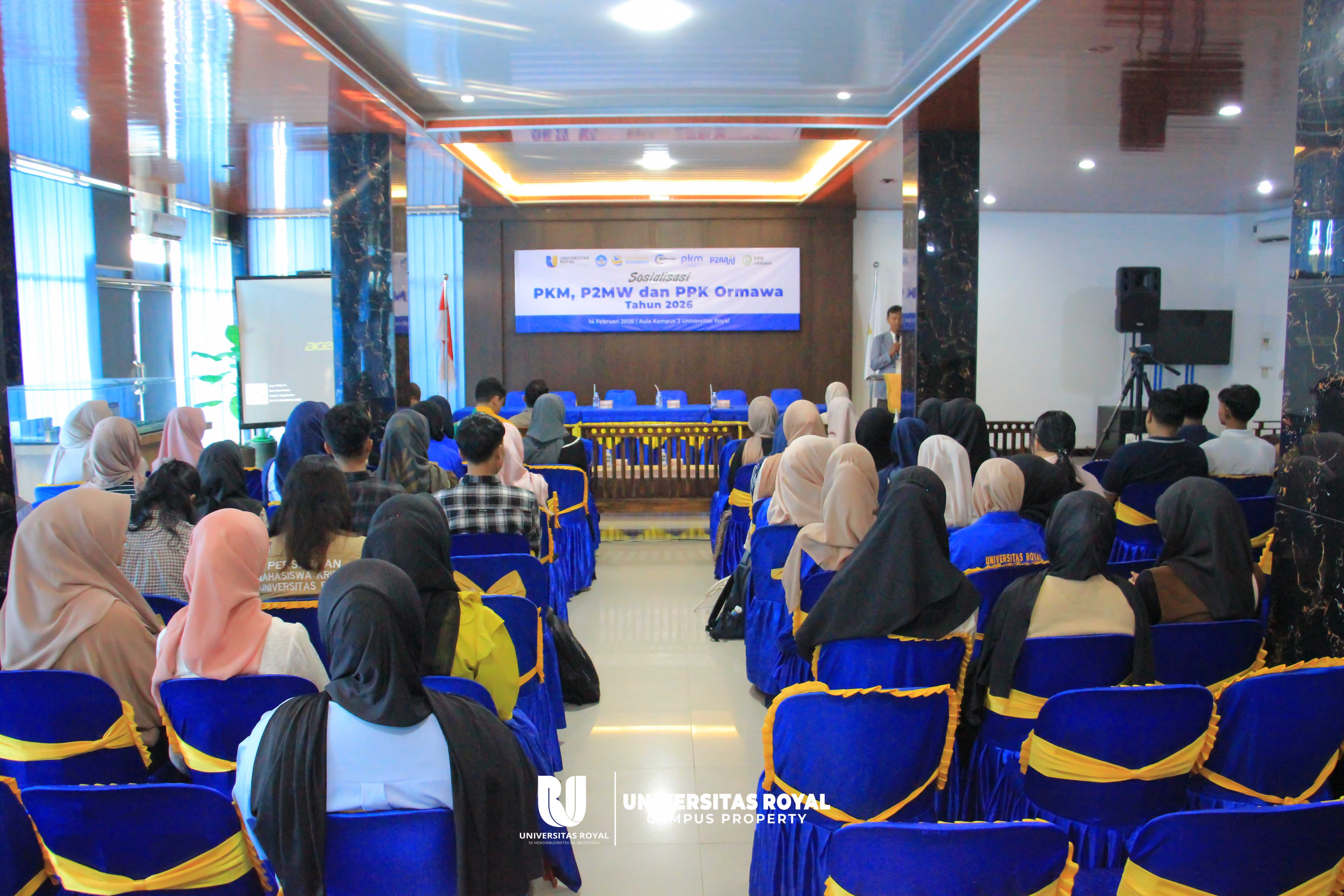 Sabtu, 14 Februari 2026 – Universitas Royal melalui bagian Kemahasiswaan menyelenggarakan kegiatan Sosialisasi PKM, P2MW, dan PPK Ormawa Tahun 2026 yang bertempat di Aula Kampus 2 Universitas Royal pada Sabtu, 14 Februari 2026. Kegiatan ini menjadi langkah strategis dalam mempersiapkan mahasiswa agar lebih siap dan kompetitif dalam mengikuti berbagai program pengembangan dan pendanaan tingkat nasional yang diselenggarakan oleh Kementerian Pendidikan, Kebudayaan, Riset, dan Teknologi.